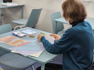 本学の構内を歩きながら自分だけの秋を探し、落ち葉などを貼り付けて絵本にするという内容でしたが、当日はあいにくの天気で外の散策は中止となり、参加者は事前に用意された落ち葉や材料を使ってオリジナルの絵本を完成させました。