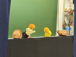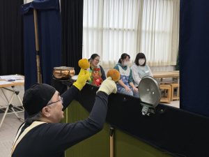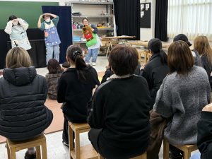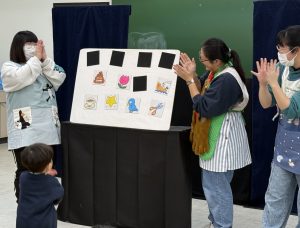 11月14日の子育てサロン「ありす」は、「人形劇を楽しもう」をテーマに、学生による手遊び、エプロンシアター、パネルシアター、幼児・児童教育学科 今野道裕教授による人形劇を披露しました。幼児保育コースの一年生も授業の一環で人形劇を一緒に鑑賞して、表現方法などを学びました。