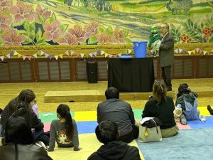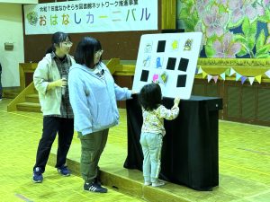 11月15日、中空知広域市町村圏組合が主催する、なかそらち図書館ネットワーク推進事業「おはなしカーニバル」が奈井江町公民館で開催され、幼児・児童教育学科 幼児保育コースの2年生8名と今野道裕教授が出演しました。学生は、手遊びやエプロンシアター、パネルシアターを、今野教授は腹話術を披露して参加した親子を楽しませました。
