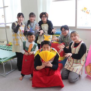2月13日の子育てサロン「ありす」は「ひなまつり」をテーマに開催しました。学生は、手作りの福笑いや、冠、扇などのおひな様の装飾品を準備して参加。一緒に福笑いを楽しんだり、装飾品をつけて写真撮影も行いました。ご参加いただいた皆様、ありがとうございました。