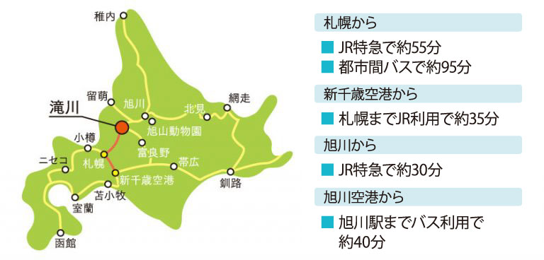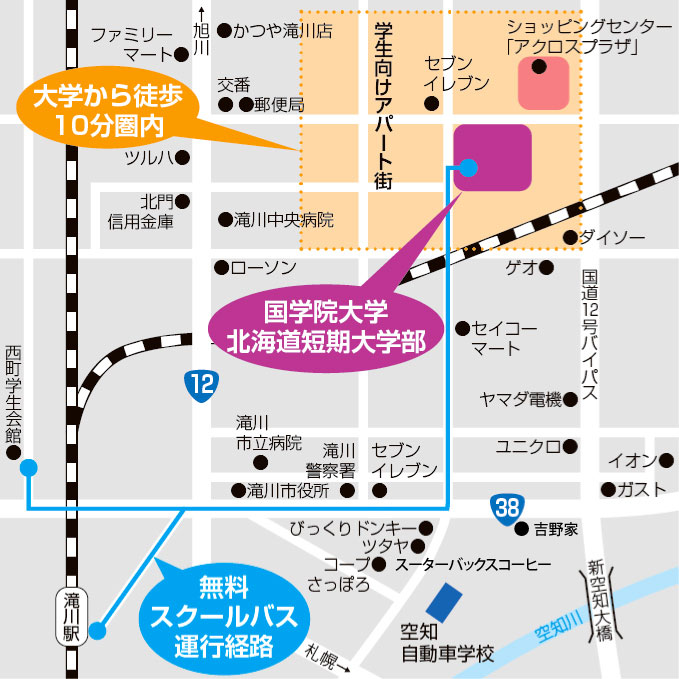 - バ ス:【滝川市内線で「国学院短大」下車 徒歩3分】