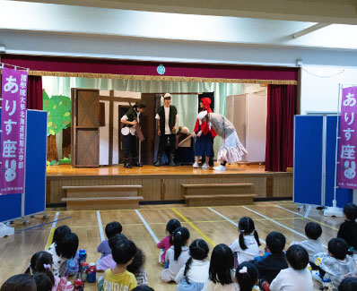 地域交流事業として、近隣の保育所、幼稚園などを訪問して児童劇、パネルシアター、手遊び、音楽発表などを披露します。児童劇は役者ばかりでなく、道具の製作や照明・音楽効果・舞台監督などの裏方も自分たちで取り組みます。そのことによって、様々な職種や性格の人と仕事を取り組んでいく力を養います。